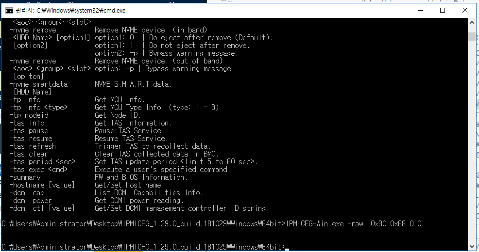 ipmitool 로 하라고 되어있는데, 윈도우는 직접 빌드해야되서 슈퍼마이크로에서 직접 주는 IPMICfg 프로그램을 이용해서 raw 명령어를 날렸다