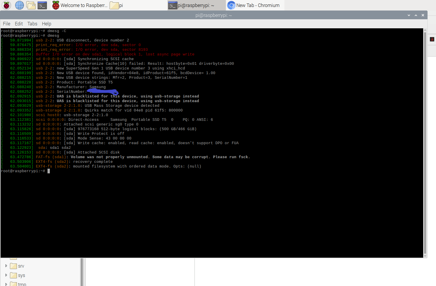 Samsung Portable SSD T5 500GB(원래는 3.1) 가 USB 3.0 에 연결되어 있고 포맷은 EXT4