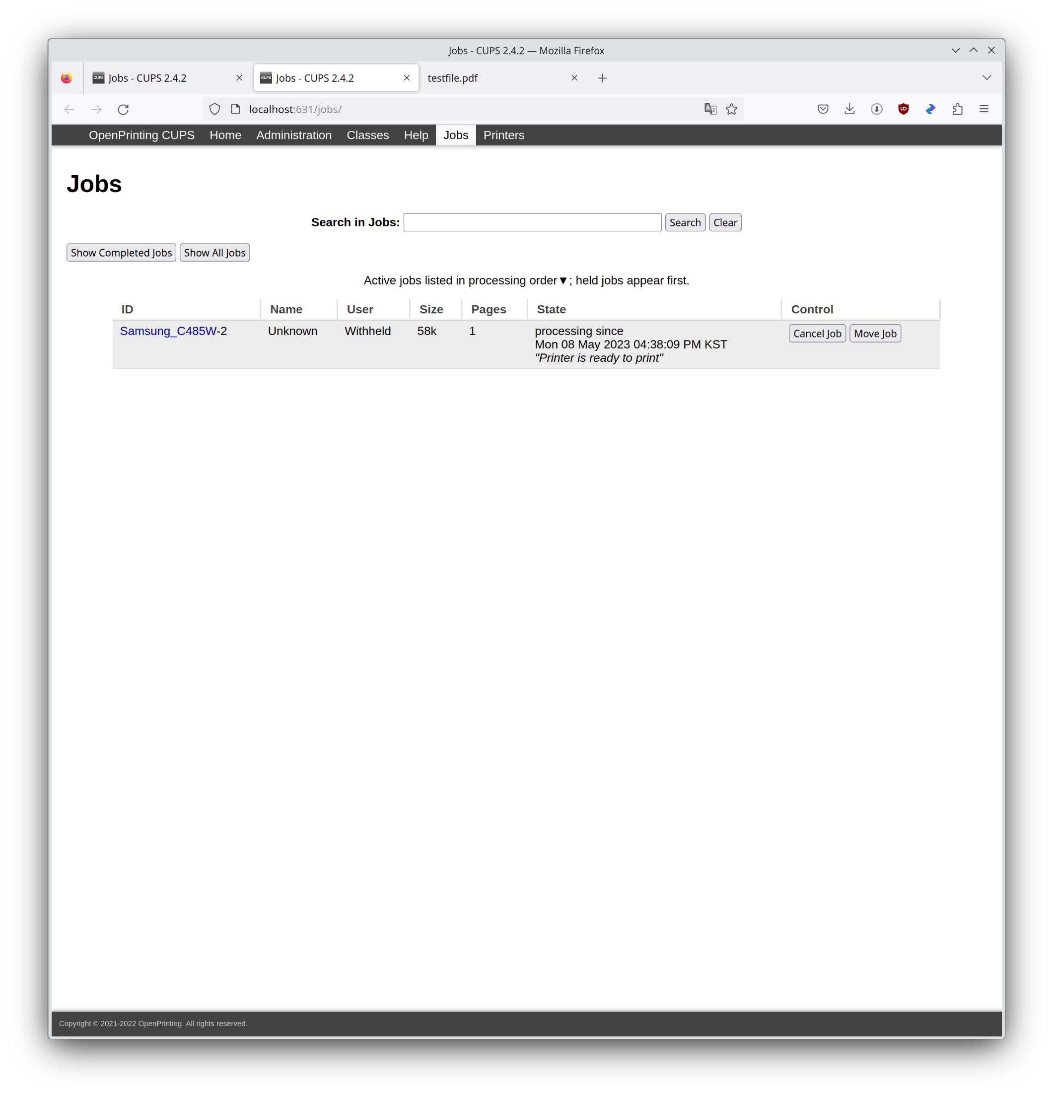 Jobs에 가니까 processing 으로 올라왔고, 프린터도 인쇄할 준비가 완료되었다고 올라온다ㅋㅋㅋ 프린트도 정상적으로 잘 되었다.