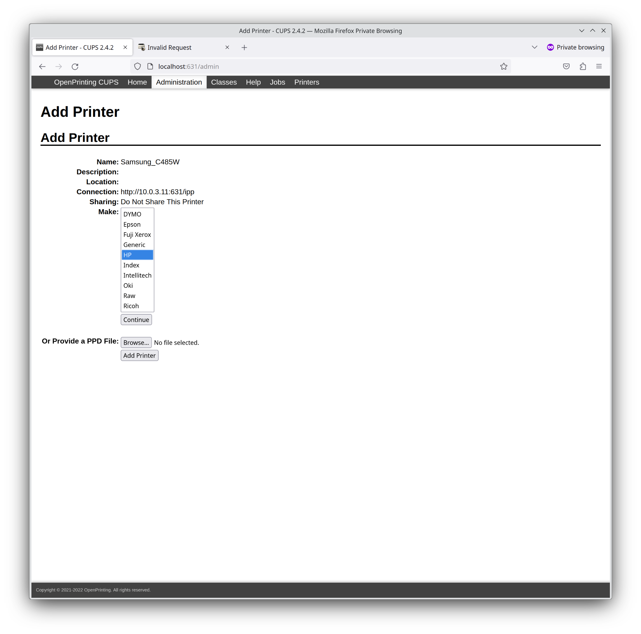 Provide a PPD file 에 아까 빼온 Samsung_C48x_Series.ppd 파일을 넣고 Add Printer를 누르니까 추가되었다고 한다.