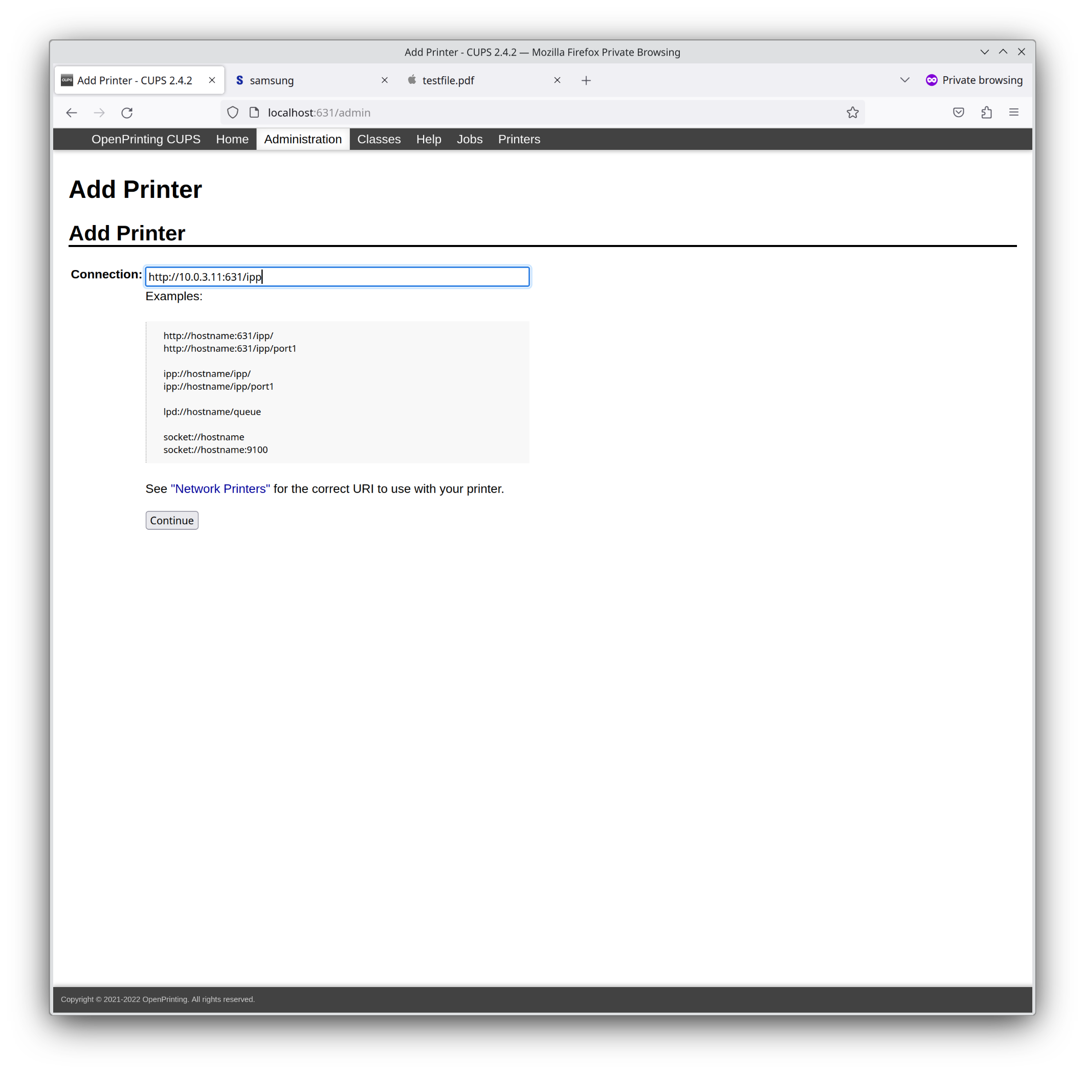 밑에 예시대로 프린터 아이피에 631 포트를 넣고 뒤에 /ipp 를 추가한다음 컨티뉴를 눌렀다.