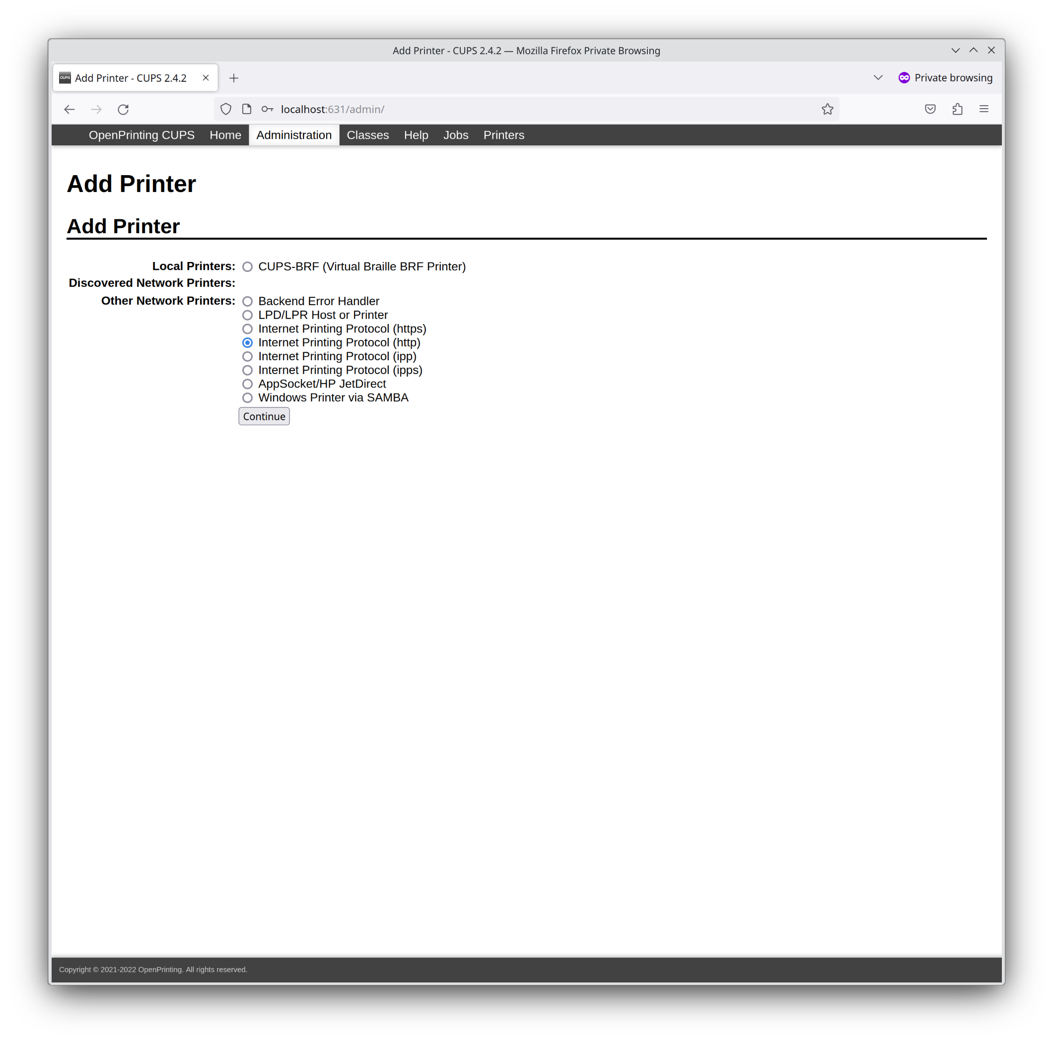 http://localhost:631 에 들어간 후 Administration 메뉴에서 Add Printer 를 누르니까 HTTP 인증 화면이 나오는 데, root 와 root 비번을 입력하니까 인증되었다. 아마 lp 와 lpadmin 그룹에 사용자를 추가해줘야할 것 같은데, 지금은 추가가 우선이라 보안따위 집어치우고, 일단 root 로 진행하려고 한다.